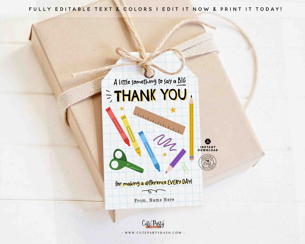 Teacher & Paraprofessional Appreciation Gift Tag Printable – Thank You Teacher School Supplies Tag – Editable Instant Download