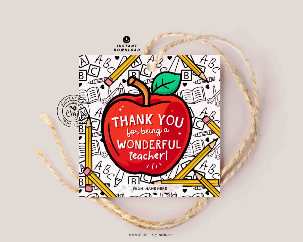 Teacher Appreciation Gift Tag Printable, Thank You Teacher Tag, Apple Teacher Gift Tag, Editable Gift Tag, Instant Download